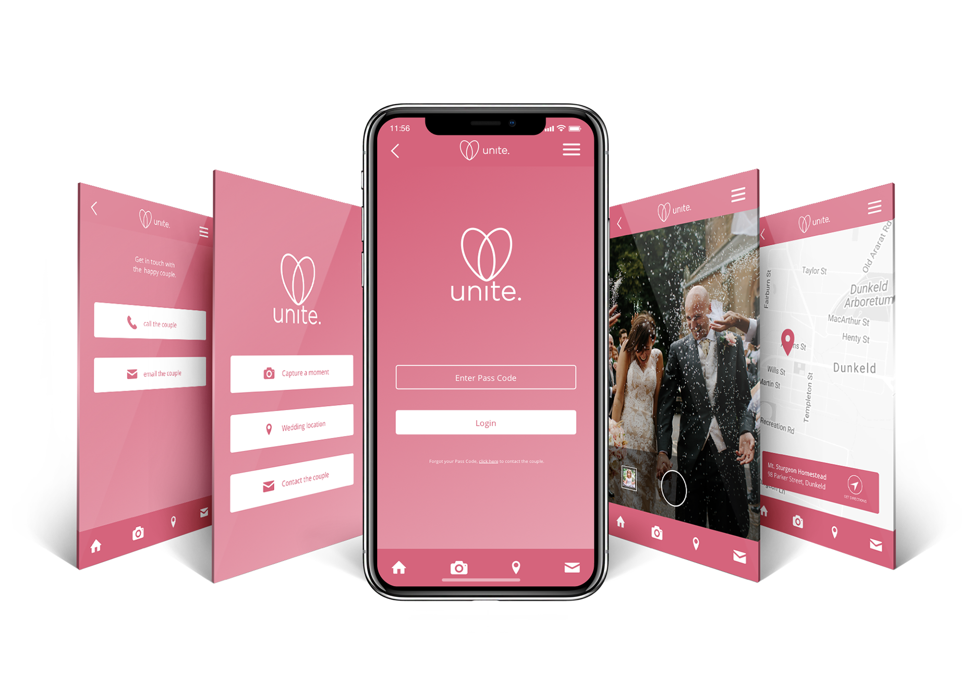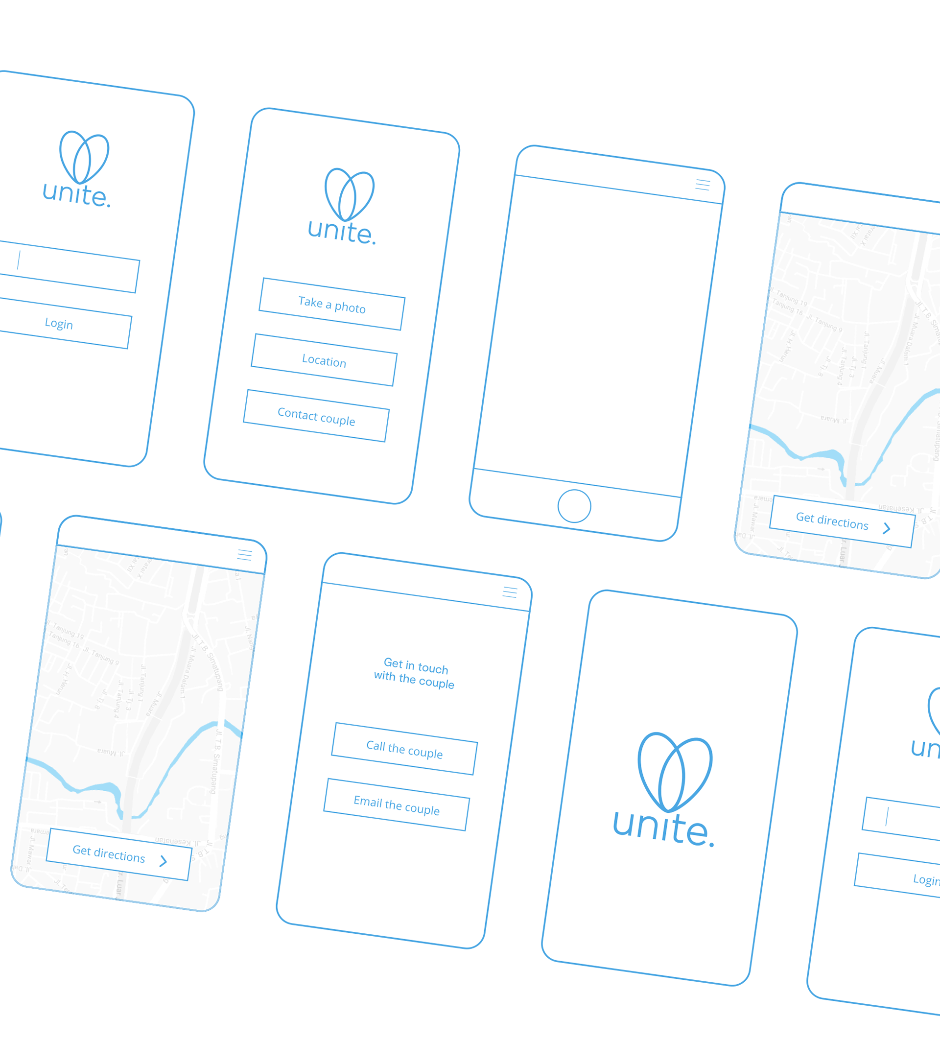 The brief was to deliver a mobile app design that was easy to use and navigate. An app that would provide useful information for the wedding guests and a way for the guests to connect with the couple by sharing a message or photos from the day.